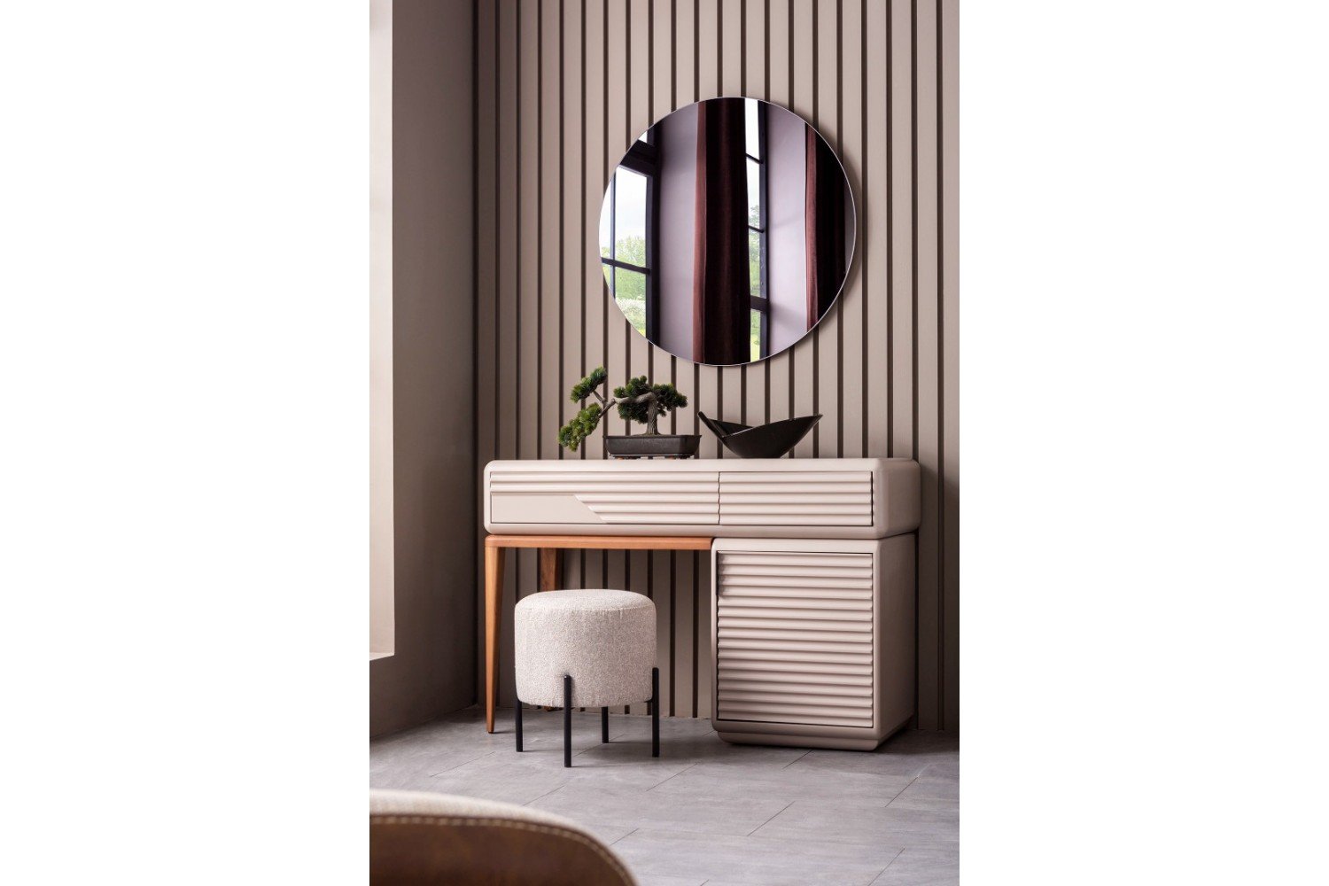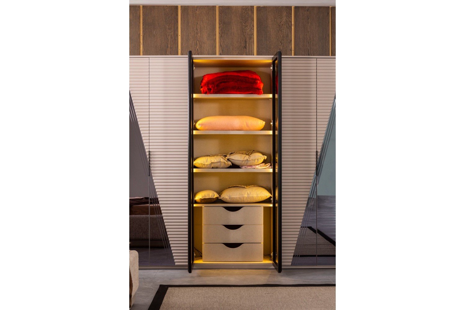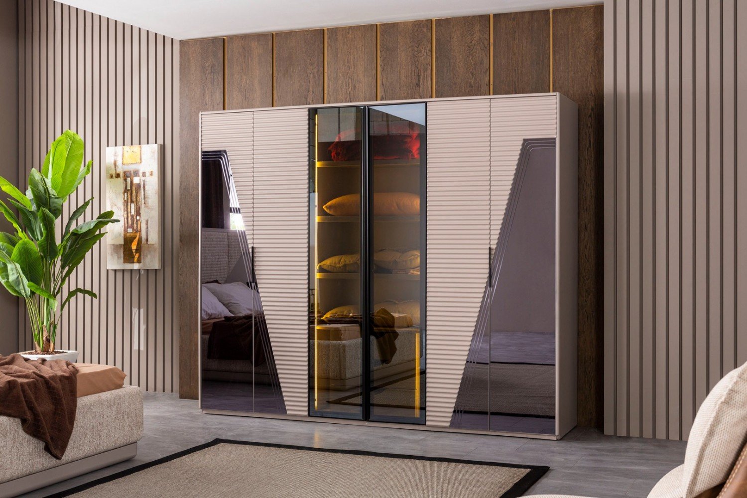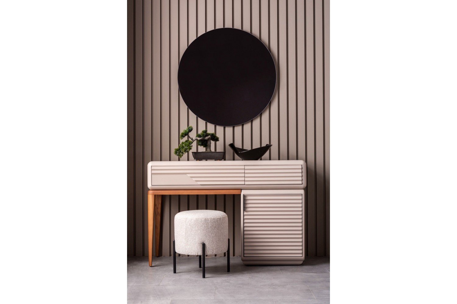 Takım İçeriği; 1 adet dolap, 1 adet şifonyer ve aynası, 1 adet karyola ve başlık ve 2 adet komodinden oluşmaktadır.